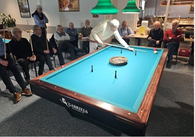 Het biljart staat gereed. Kleine houten kegeltjes staan op het laken en in het midden ligt een groot houten ovaal uit 1914. Aan de zijkant ligt aan de korte band een witte bal, waarmee iedere speler speelt. Aan de andere zijde ligt de rode bal, die met de witte bal moet worden geraakt.
